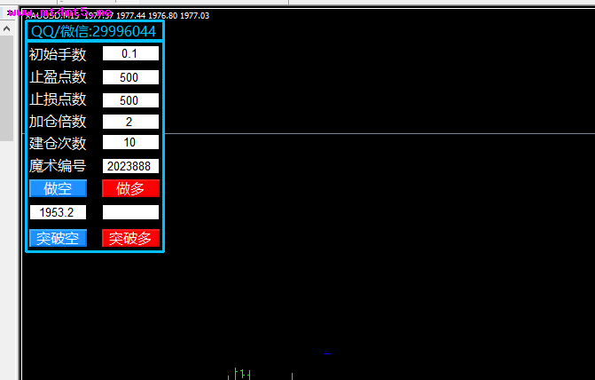 MT4趋势突破半自动马丁策略ea这是一个MT4趋势突破类半自动马丁策略的ea。凡是马丁类策略,啥,你不知道马丁是啥意思?就是鞅策略,倍投的策略,都要尽量的半自动,全自动基本必死的,参数有初始手数,止盈点数,止损点数,加码倍数。减仓次数等。可以点击图表的做多做空按钮,直接做多做空。第一单也可以设置做多做空的挂单来进行交易。任何行情都不可能一直震荡,这个ea就是赌的趋势起来,我们大赚一笔。VIP会员下载:MT4趋势突破半自动马丁策略ea