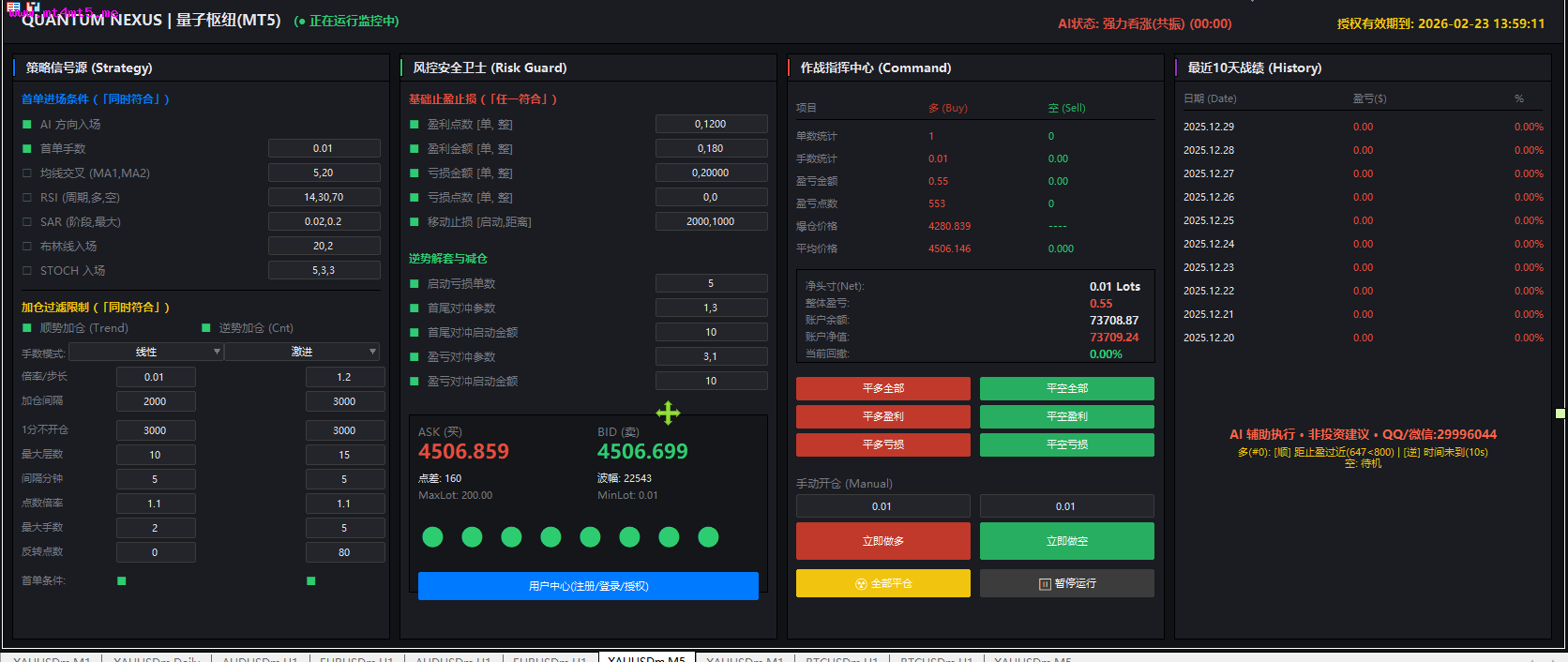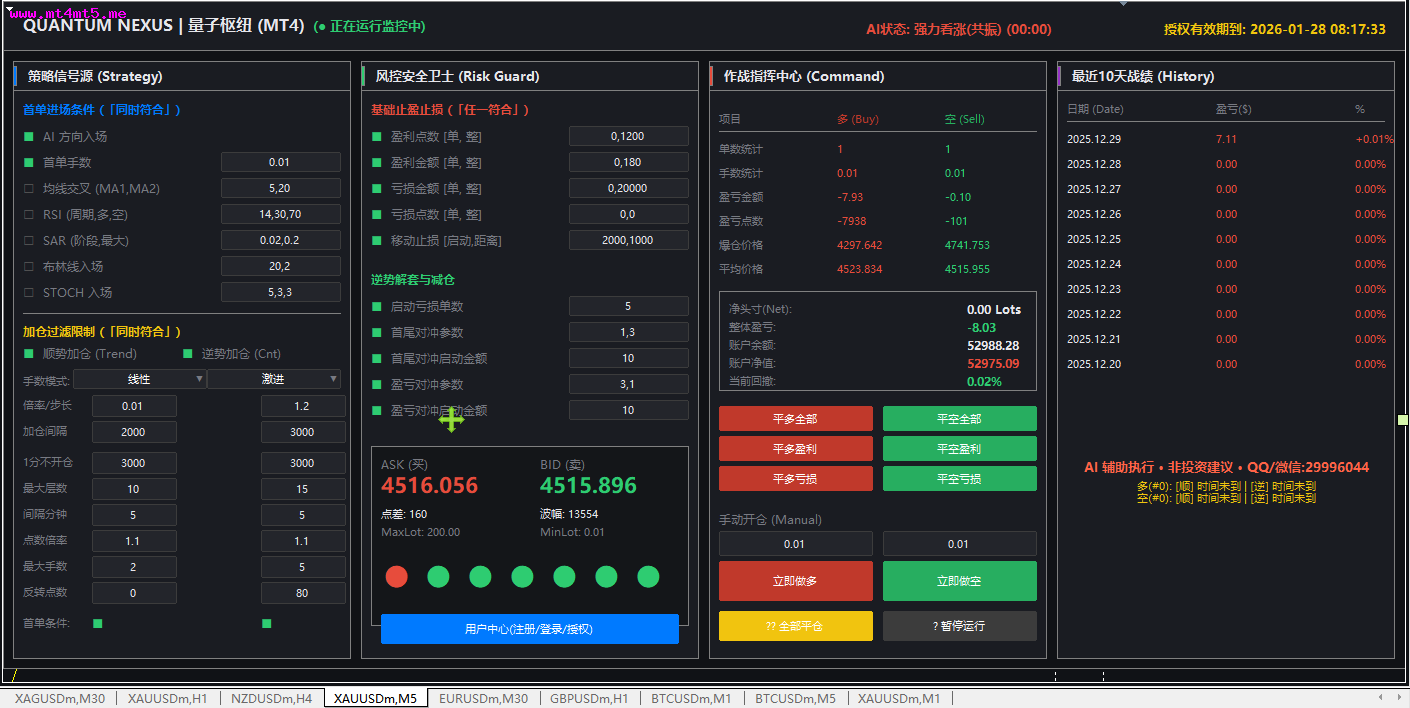 QUANTUM NEXUS|量子枢纽EA(MT4/MT5)发布全自动 AI 量化交易中枢 · 24H 智能监控运行中界面截图:【策略信号源 Strategy Engine】多维共振 · 精准出手 · 只做高确定性行情 划时代·真AI·云端交易革命 ✨ 【颠覆性科技】真正的AI数据模型驱动 —— 非伪智能,非简单算法!百亿级神经元在云端7×24小时为您而战,您的电脑只是发布王令的权杖,不是烧机的矿工 AI 趋势智能识别深度解析市场主方向,过滤无效波动非追涨杀跌,只介入结构性机会 多指标量子共振确认MA 趋势结构RSI 多周期强弱判断SAR 阶段拐点捕捉STOCH 动量同步验证 多条件同时满足才允许开仓,拒绝情绪交易 智能入场模块单笔精准建仓绝不盲目频繁交易专为震荡与趋势行情优化【加仓与追踪系统 Position Booster】让利润奔跑,而不是让风险失控 顺势智能加仓(Trend Boost)利润确认后才加仓趋势越强,收益释放越充分逆势防御型加仓(Control Grid)非马丁乱加所有加仓均纳入风险模型 动态仓位演算引擎手数自动缩放仓位层级清晰杜绝“一口气把账户干没”【风险安全卫士 Risk Guard】不是“能赚”,而是“能活得久”基础止损体系(硬防线)单笔最大风险锁定盈亏比结构化控制 智能浮动保护(软防线)盈利自动保护回撤实时压制逆向容错机制市场异常自动降频极端行情主动收缩仓位 目标只有一个:回撤可控,账户可持续增长【作战指挥中心 Command Center】所有仓位,一屏掌控 多 / 空 实时作战态势持仓数量成本均价盈亏结构净头寸一目了然一键级指令系统全部平多 全部平空智能锁盈 紧急止损 手动 & AI 双模控制人工干预随时接管AI 执行毫秒级响应【历史战绩回溯 History Log】每一笔交易,都经得起回看 10 日滚动绩效统计日盈亏透明展示收益率完整记录拒绝“截图收益”不修图不挑日子不隐藏回撤真实曲线,比任何承诺都有说服力【AI 智能辅助系统】不是“托管”,而是“智能执行官”7×24 小时行情扫描自动过滤低质量信号 严格执行既定交易纪律 QUANTUM NEXUS|量子枢纽EA 不是单一策略,而是模块化量化系统 不是高频赌博,而是概率优势叠加 不是暴利幻想,而是长期生存模型 QUANTUM NEXUS|量子枢纽EA用系统对抗情绪用规则对抗人性用科技换取稳定性免费下载:QUANTUMNEXUS量子枢纽EAMT4测试版QUANTUMNEXUS量子枢纽EAMT5测试版